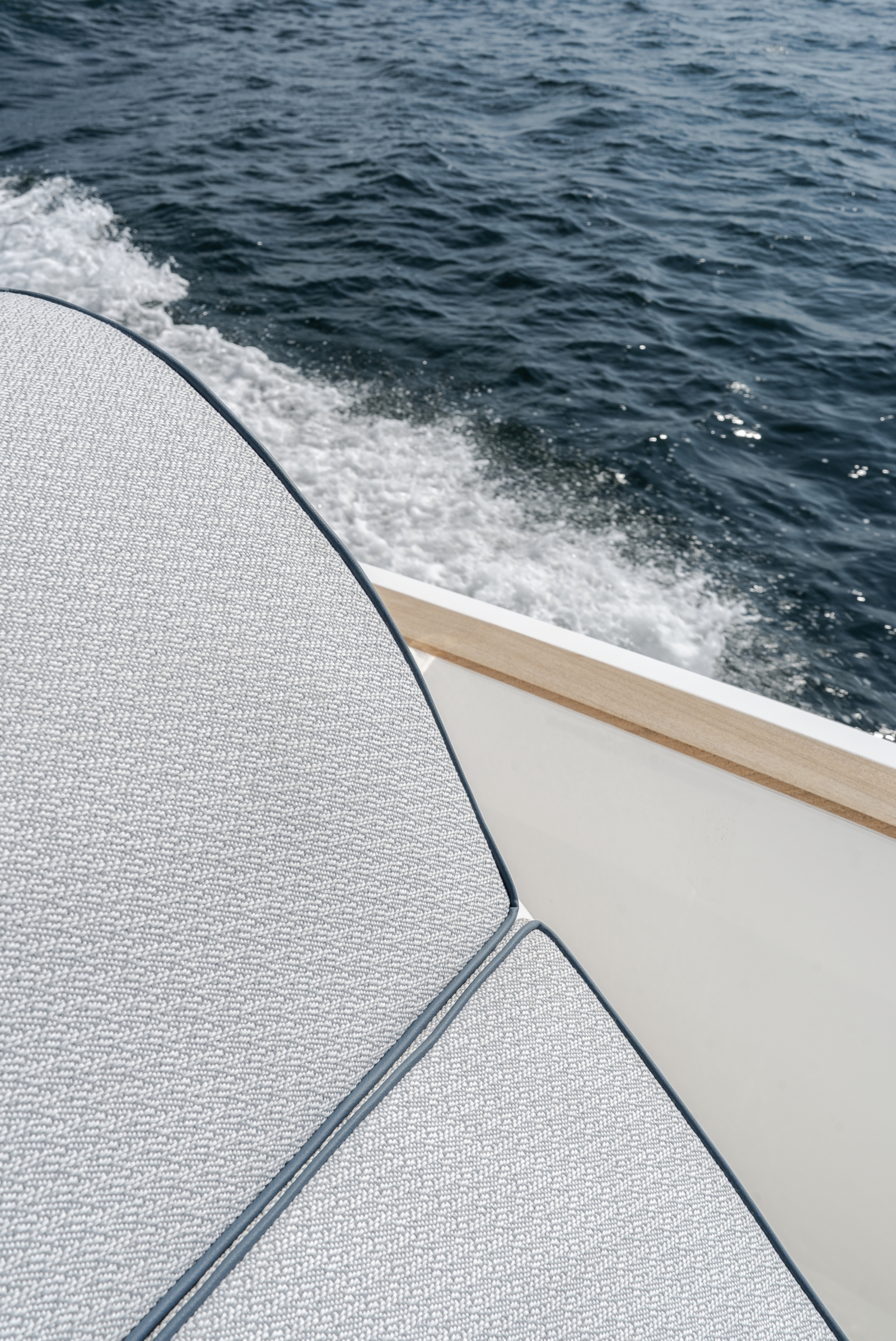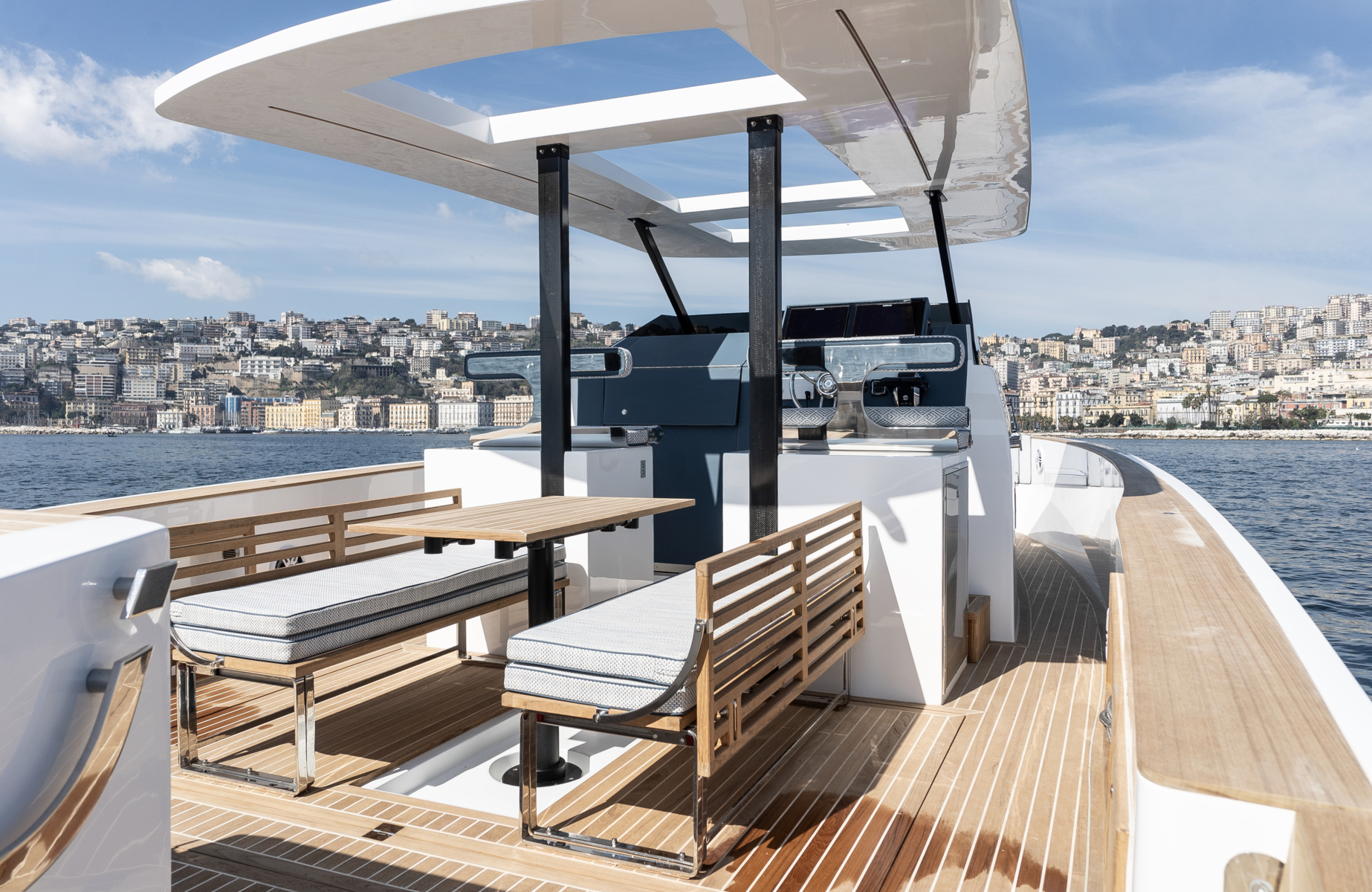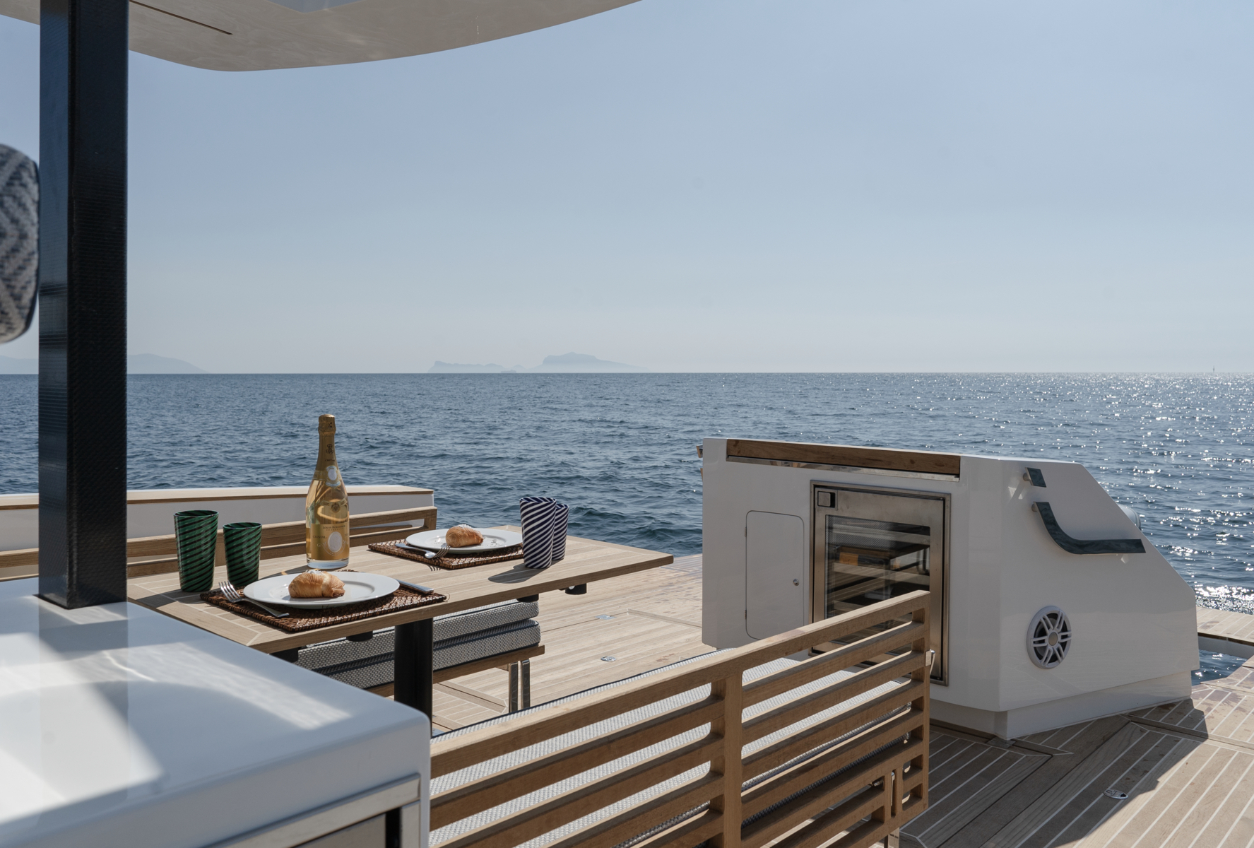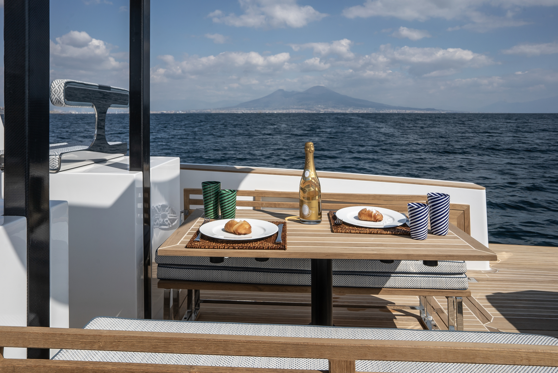 La parte inferiore della chaise longue può essere sollevata con una sola mano dando accesso ad un vano asciutto in cui riporre le valigie per evitare di posizionarle direttamente all’interno della cabina ma garantendo la massima accessibilità durante la giornata.Di fronte alla chaise longue è presente un altro ampio divano che funge da prendisole o da seduta per altre 3 persone. L’area dedicata all’ancora si caratterizza per il massimo del minimalismo, il meccanismo a scomparsa permette infatti di mantenere quell’area completamente sgombra e restituire una linea esterna estremamente accattivante e pulita.