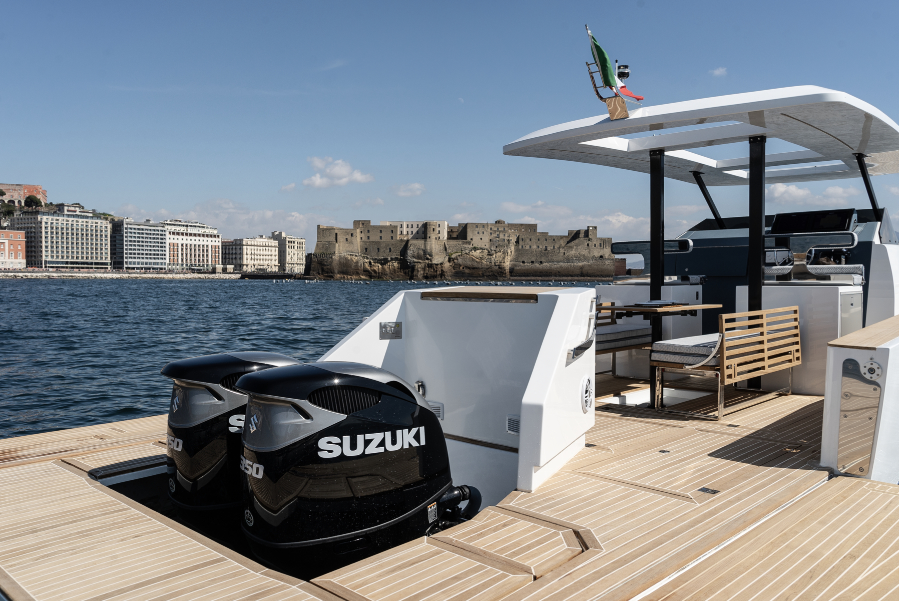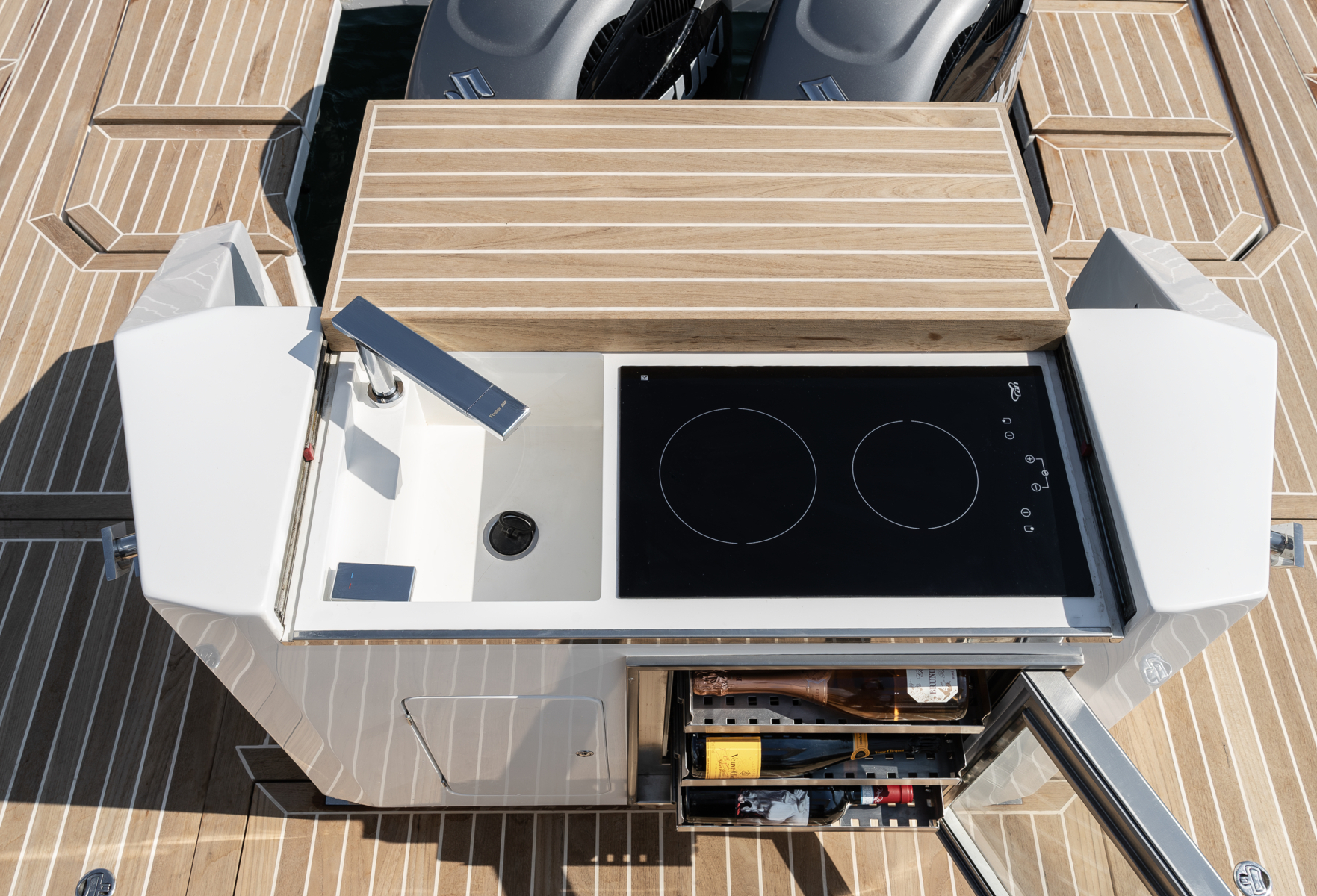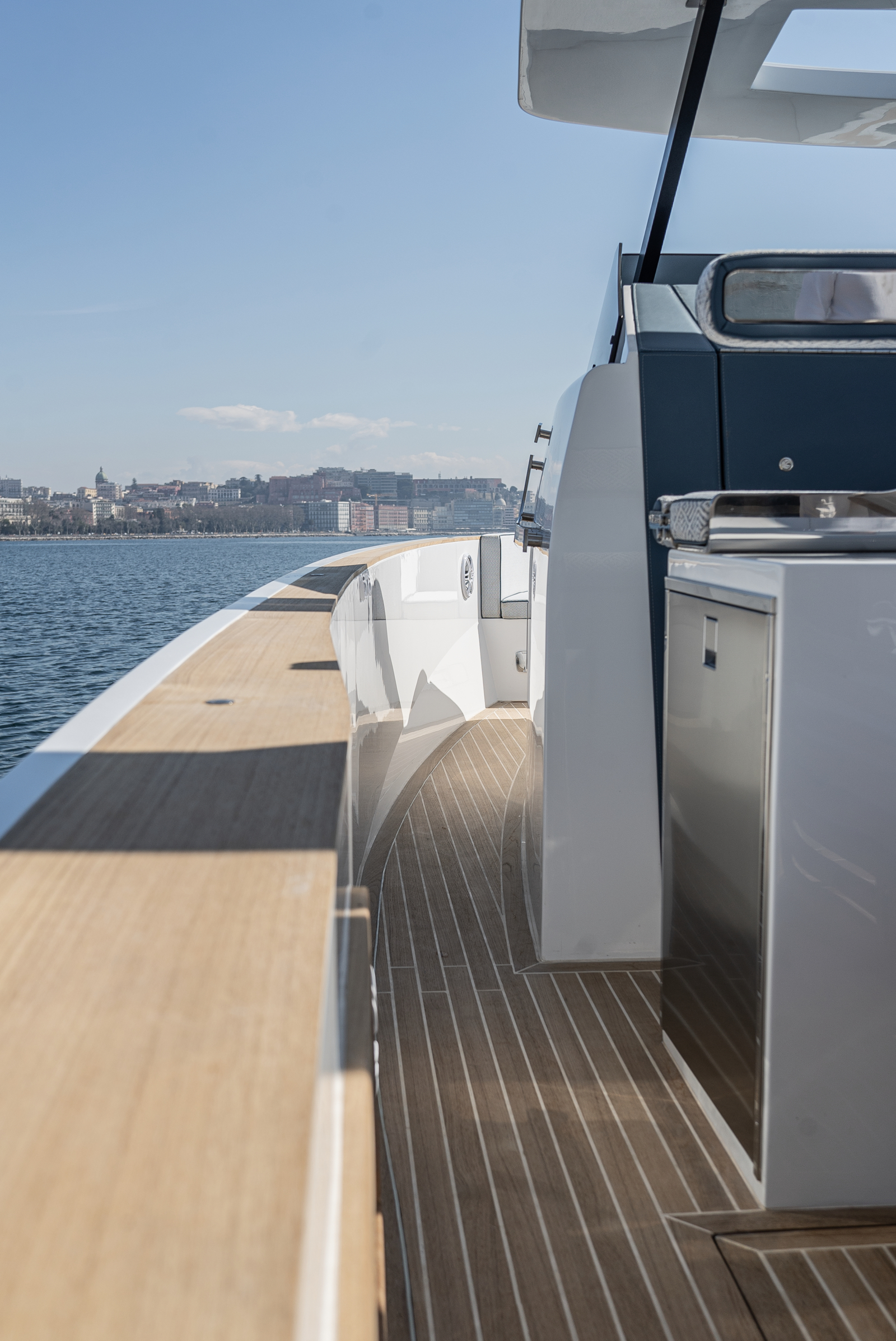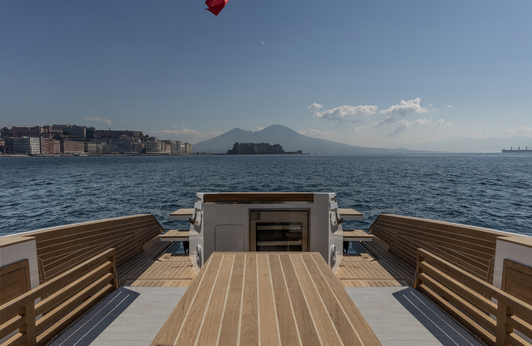 La parte inferiore della chaise longue può essere sollevata con una sola mano dando accesso ad un vano asciutto in cui riporre le valigie per evitare di posizionarle direttamente all’interno della cabina ma garantendo la massima accessibilità durante la giornata.Di fronte alla chaise longue è presente un altro ampio divano che funge da prendisole o da seduta per altre 3 persone. L’area dedicata all’ancora si caratterizza per il massimo del minimalismo, il meccanismo a scomparsa permette infatti di mantenere quell’area completamente sgombra e restituire una linea esterna estremamente accattivante e pulita.